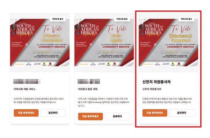 Áö³­ÇØ ¸» ½ÅõÁö À¯°ü ¾ð·Ð ¡¸ÃµÁöÀϺ¸¡¹¿¡ ½ÅõÁöÀÚ¿øºÀ»ç´Ü ³²¾Æ°øÁöºÎ°¡ ¡®³²¾ÆÇÁ¸®Ä« ¿µ¿õ»ó(South African Heros Awards) Áö¿ª »çȸ ºÀ»ç ´ë»ó¡¯À» ¼ö»óÇß´Ù°í ÀüÇß´Ù. ¡¸ÃµÁöÀϺ¸¡¹´Â ÇØ´ç º¸µµ¿¡¼­ Àü±¹ ´ÜÀ§ °øÀÍ È°µ¿À» ´ë»óÀ¸·Î ÇÑ ÃÖ°í ±ÇÀ§ÀÇ ½Ã»ó½ÄÀ¸·Î Æò°¡¹Þ°í ÀÖ´Ù°í ÀÚÂùÇß´Ù.