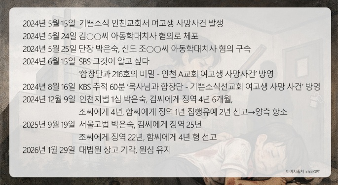 »ç°ÇÀº 2024³â 5¿ù 15ÀÏ ±â»Û¼Ò½ÄÀÎõ±³È¸ ¼÷¼Ò¿¡¼­ ¼÷½ÄÇÏ´ø 17¼¼ ¿©°í»ýÀÌ ÀǽÄÀ» ÀÒÀº ä ¹ß°ßµÇ¸é¼­ ½ÃÀ۵ƴÙ. ÇÇÇØÀÚ´Â ½Åü Àü¹Ý¿¡ ¸Û°ú °á¹Ú ÈçÀûÀÌ ÀÖ¾ú°í ¹ß°ß ÈÄ º´¿øÀ¸·Î ¿Å°ÜÁ³Áö¸¸ 4½Ã°£ µÚ »ç¸ÁÇß´Ù. ¡®Æó»öÀüÁõ¡¯À» »çÀÎÀ¸·Î ÃßÁ¤ÇÑ ±¹¸³°úÇмö»ç¿¬±¸¿øÀº Çдë Á¤È²ÀÌ ÀÖ´Ù´Â ¼Ò°ßÀ» ¹àÇû´Ù.