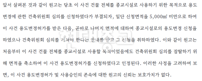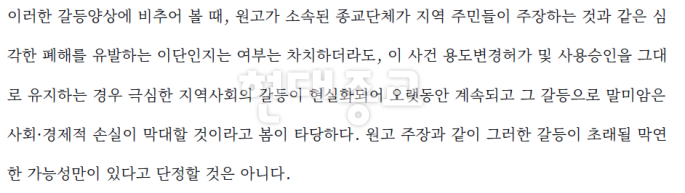 °á°úÀûÀ¸·Î ÀçÆÇºÎ´Â ¡°¿ø°í°¡ ¼Ò¼ÓµÈ Á¾±³´Üü(½ÅõÁö)°¡ Áö¿ª ÁֹεéÀÌ ÁÖÀåÇÏ´Â °Í°ú °°Àº ½É°¢ÇÑ ÆóÇØ¸¦ À¯¹ßÇÏ´Â ÀÌ´ÜÀÎÁö ¿©ºÎ´Â Â÷Ä¡ÇÏ´õ¶óµµ, ÀÌ »ç°Ç ¿ëµµº¯°æÇã°¡ ¹× »ç¿ë½ÂÀÎÀ» ±×´ë·Î À¯ÁöÇÏ´Â °æ¿ì ±Ø½ÉÇÑ Áö¿ª»çȸÀÇ °¥µîÀÌ Çö½ÇÈ­µÇ¾î ¿À·§µ¿¾È °è¼ÓµÇ°í ±× °¥µîÀ¸·Î ¸»¹Ì¾ÏÀº »çȸ, °æÁ¦Àû ¼Õ½ÇÀÌ ¸·´ëÇÒ °ÍÀ̶ó°í º½ÀÌ Å¸´çÇÏ´Ù¡±°í ÆÇ°áÇß´Ù.