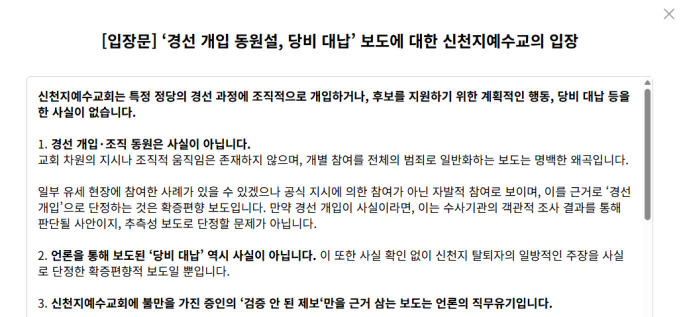 ÇØ´ç ÀÔÀå¹®¿¡´Â ¡°±³È¸ Â÷¿øÀÇ Áö½Ã³ª Á¶Á÷Àû ¿òÁ÷ÀÓÀº Á¸ÀçÇÏÁö ¾ÊÀ¸¸ç, °³º° Âü¿©¸¦ ÀüüÀÇ ¹üÁË·Î ÀϹÝÈ­ÇÏ´Â º¸µµ´Â ¸í¹éÇÑ ¿Ö°î¡±À̶ó°í °­Á¶Çß´Ù. ¶ÇÇÑ ´çºñ ´ë³³°ú °ü·ÃÇØ¼­´Â ¡°»ç½Ç È®ÀÎ ¾øÀÌ ½ÅõÁö Å»ÅðÀÚÀÇ ÀϹæÀûÀÎ ÁÖÀåÀ» »ç½Ç·Î ´ÜÁ¤ÇÑ È®ÁõÆíÇâÀû º¸µµ¡±¶ó°í ºñ³­Çß´Ù. ÇÏÁö¸¸ 1¿ù 23ÀÏ ÀÌÈÄ¿¡´Â ÀÔÀå¹®Á¶Â÷ ³»Áö ¾Ê°í ÀÖ´Ù.