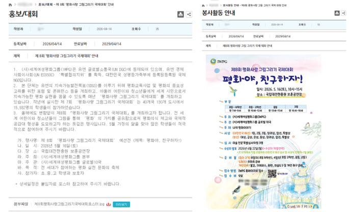 ÀÌÈÄ ´ëÀü Áö¿ª ÃÊ¡¤ÁßÇб³¿¡¼­µµ °ü·Ã °øÁö¸¦ È®ÀÎÇÒ ¼ö ÀÖ¾ú´Ù. °øÁö´Â ¡°Àü ¼¼°è ¾î¸°ÀÌ¿Í Ã»¼Ò³âµéÀÌ ±×¸²À» ÅëÇØ ¡®ÆòÈ­¡¯ÀÇ °¡Ä¡¸¦ °øÀ¯ÇÔÀ¸·Î½á ÆòÈ­ÀÇ½Ä Á¦°í¿Í ±¹Á¦Àû °ø°¨´ë Çü¼ºÀ» µµ¸ðÇϰíÀÚ ÇÏ´Â ¶æ±íÀº Çà»ç¡±¶ó°í ÃëÁö¸¦ ¹àÈ÷¸ç, 5¿ù 16ÀÏ ±¹¸³´ëÀüÇöÃæ¿ø º¸Èưø¿¬Àå¿¡¼­ ¡®³ªÀÇ ÆòÈ­À̾߱⡯¶ó´Â ÁÖÁ¦·Î ¿­¸°´Ù´Â ³»¿ëÀ» ´ã°í ÀÖ´Ù.