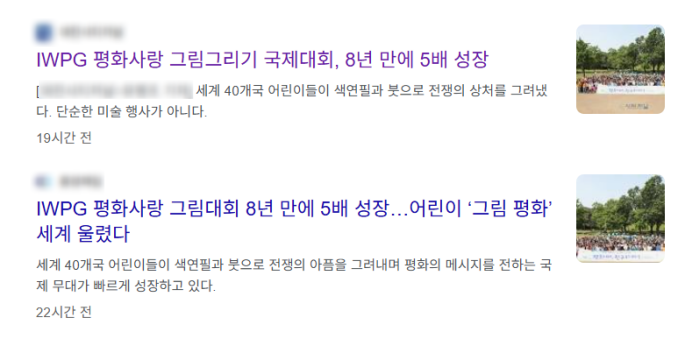 À̸¦ µÞ¹ÞħÇϵí, 4¿ù 15ÀϰæºÎÅÍ IWPG ÆòÈ­»ç¶û ±×¸²±×¸®±â ±¹Á¦´ëȸ°¡ 8³â ¸¸¿¡ 5¹è ¼ºÀåÇßÀ¸¸ç, ¼¼°è¿¡ ÀÖ´Â ÇлýµéÀÌ Âü°¡Çϰí ÀÖ´Ù´Â ³»¿ëÀÇ ±â»ç°¡ º¸µµÀڷḦ »Ñ¸° °Íó·³ °ÔÀçµÇ°í ÀÖ´Ù.
