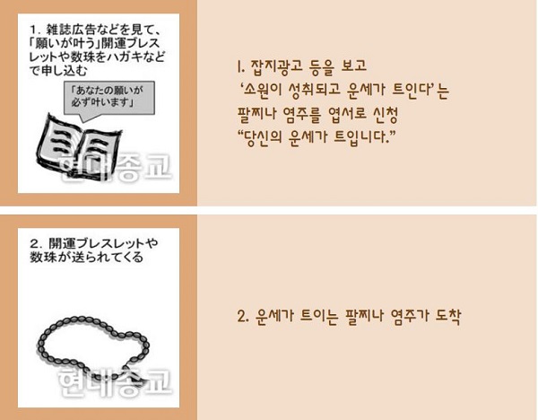ÃÖ±Ù ÀϺ»ÀÇ »çÀ̺ñ Á¾±³´Â ±³¸® ¼³ÆÄ¸¦ ÅëÇÑ ¼¼³ú ¹× ¸¶ÀεåÄÁÆ®·Ñ, Çå±Ý°­¿ä, ÆøÇà µî ±âÁ¸ÀÇ ¹æ¹ýÀÌ ¾Æ´Ñ »õ·Î¿î ÇüÅ·Π»çȸÀû ¹°ÀǸ¦ ÀÏÀ¸Å°°í ÀÖ´Ù. À̸¥¹Ù °³¿î»ó¹ý(ËÒê¡ßÂÛö, ¿î¼¼°¡ Æ®Àδٴ »ó¹ý)ÀÌ »çȸÀû¹®Á¦°¡ µÇ°í ÀÖ´Ù. ÀâÁö±¤°í³ª ´ÙÀÌ·ºÆ® ¸ÞÀÏ µîÀ» ÀÌ¿ëÇØ ¿î¼¼°¡ Æ®Àδٴ »óǰÀ» ÆÇ¸ÅÇÏ°í ±× »óǰÀ» ÅëÇØ ¿µÀûÀ¸·Î °¨Á¤À» ÇÑ´Ù°í ¼±ÀüÇÑ´Ù. ±¤°í¸¦ º» ¼ÒºñÀÚ°¡ Á¦Ç°À» ±¸ÀÔÇÏ°í »ç¿ë¹®Àdzª ±¸ÀÔ ÈÄ¿¡ È¿°ú°¡ ¾ø´Ù°í ºÒ¸¸À» Åä·ÎÇÏ¸é “´ç½ÅÀº ¾ÆÁÖ ÁÁÀº ¿î¼¼°¡ ÀÖÁö¸¸, ´ç½Å¿¡°Ô ºÙ¾îÀÖ´Â ¾Ç·ÉÀÌ ¿î¼¼°¡ Æ®ÀÌ´Â °ÍÀ» ¹æÇØÇϰí ÀÖ´Ù. ±×°ÍÀ» Á¦°ÅÇÏ¸é °í¾× º¹±Ç¿¡ ´ç÷µÇ´Â µî º¹ÀÌ ¿Â´Ù”°í ÇÑ´Ù. ¼ÒºñÀÚÀÇ °í¹ÎÀ̳ª ºÒ¾È, »çÇà½ÉÀ» ºÎÃß°Ü ¾Ç·ÉÀ» ÂѾƳ»°í ±âµµ´ë±ÝÀÇ ¸í¸ñÀ¸·Î °Å¾×À» ÁöºÒ½ÃŰ´Â °ÍÀÌ °³¿î»ó¹ýÀÌ´Ù.