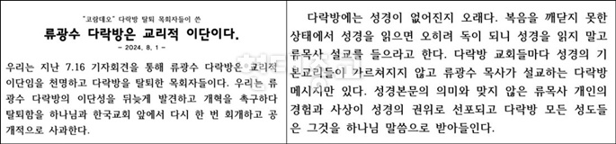 ´Ù¶ô¹æ(·ù±¤¼ö, °ø½Ä¸íĪ ¼¼°èº¹À½È­ÀüµµÇùȸ)Àº ¿©·¯ ±³´Ü¿¡¼­ ÀÌ¹Ì ÀÌ´Ü µîÀ¸·Î °áÀÇÇÑ °÷ÀÌ´Ù. ±³´Ü¿¡¼­ ÀÌ´ÜÀ¸·Î °áÀÇÇß´Ù´Â °ÍÀº ½ÅÇÐÀûÀÎ ¹®Á¦°¡ ÀÖÀ½À» ÀǹÌÇÑ´Ù. ´Ù¶ô¹æ ¹ÛÀ¸·Î ³×À̹ö Ä«Æä¿¡¼­ Å»ÅðÀÚµéÀÇ ¸ñ¼Ò¸®¸¦ µéÀ» ¼ö ÀÖ¾ú´Ù. Å»ÅðÀÚµéÀº ¡°¼º°æ°ú ´Ù¸§À» ¾Ë°Ô µÇ¾ú´Ù¡±, ¡°´Ù¶ô¹æ ±³¸®°¡ Á¤Åë½ÅÇаú ´Ù¸¥ ºÎºÐÀÌ Á¸ÀçÇϰí, ÀÌ ºÎºÐ¿¡ ´ëÇÑ ¼öÁ¤, ȸ°³, °»½ÅÀ» Ã˱¸ÇÏ´Â ¸ñ»ç, ÁßÁ÷ÀÚµéÀÇ ¸ñ¼Ò¸®¿¡ ¹Ì¿ÂÀûÀ¸·Î ´ëóÇÏ´Â ºÐÀ§±â¿´´Ù¡±´Â µîÀÇ ÀÌÀ¯¸¦ ÀüÇß´Ù. Å»Åð ¸ñȸÀÚµéÀº ´Ù¶ô¹æÀÌ º£·Ú¾Æ ±Í½Å·Ð, ±¸¿øÆÄ À²¹ýÆó±â·ÐÀ» °®°í ÀÖ´Ù°í ÀÔÀ» ¸ð¾Ò´Ù. ÈçÈ÷ Á¤Ä¡ÀûÀ¸·Î ÀÌ´ÜÀÌ µÇ¾ú´Ù´Â ¹Ý¹ÚÀ» ºÎÁ¤ÇÏ¸ç ±³¸®ÀûÀÎ ÀÌ´ÜÀÓÀ» °­Á¶ÇÑ´Ù. ÃÖ±Ù¿¡µµ Å»Åð ¸ñȸÀÚµéÀº 29ÂÊ¿¡ ´ÞÇÏ´Â ¡°·ù±¤¼ö ´Ù¶ô¹æÀº ±³¸®Àû ÀÌ´ÜÀÌ´Ù¡±¶ó´Â Á¦ÇÏÀÇ ±ÛÀ» ¹èÆ÷Çß´Ù.