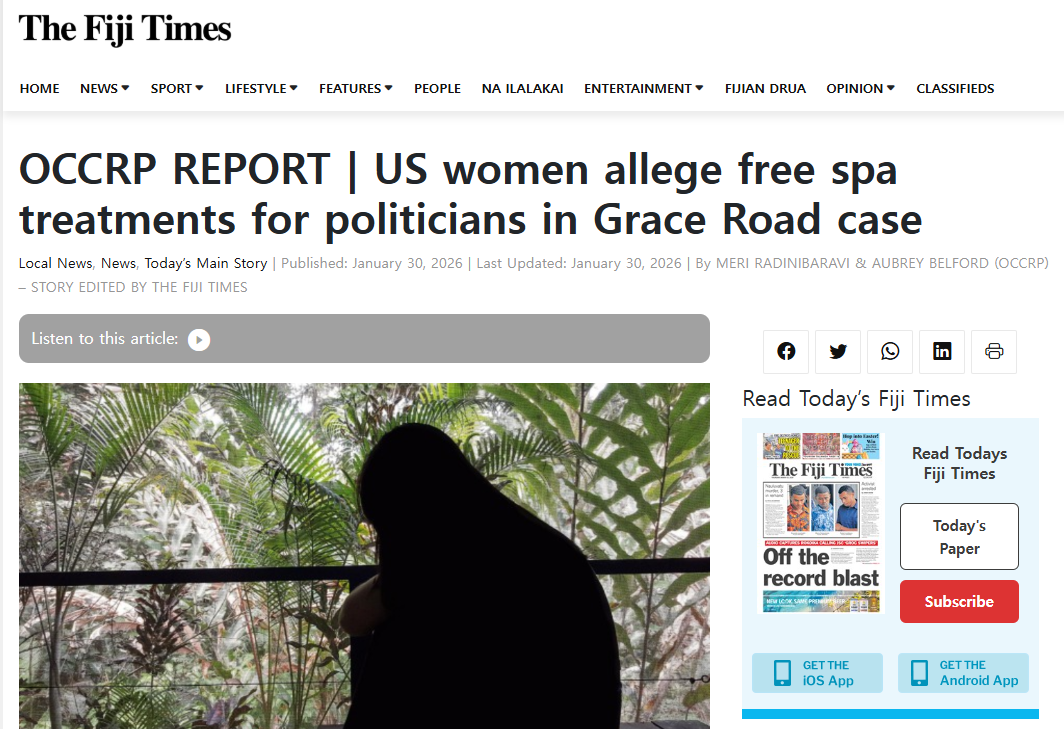 OCCRP(Organized Crime and Corruption Reporting Project, Ž»ç Àú³Î¸®Áò ´Üü) º¸°í¼­¸¦ ÀοëÇÑ ¡¸ÇÇÁöŸÀÓÁ´Â ¡°GR±×·ì¿¡¼­ Å»ÃâÇÑ ¹Ì±¹ ±¹ÀûÀÇ ¿©¼º µÎ ¸í Áß ÇÑ ¸íÀÌ ÇØ´ç ´Üü ³»ºÎ¿¡ ÀÖ´Â µ¿¾È ÇÇÁöÀÇ À¯·Â Àλçµé¿¡°Ô ¸¶»çÁö µîÀÇ ¹«·á ½Ã¼úÀ» Á¦°øÇß´Ù°í ÁÖÀåÇß´Ù¡±°í Æø·ÎÇß´Ù.